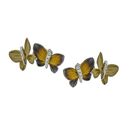 These earrings feature a pair of sculpted butterflies with richly textured wings in warm golden and amber tones, accented by diamond-set bodies. Their organic design captures a sense of movement and natural beauty with an artistic, refined finish.