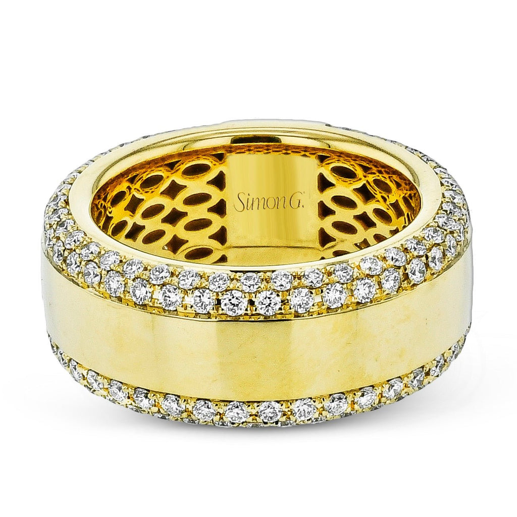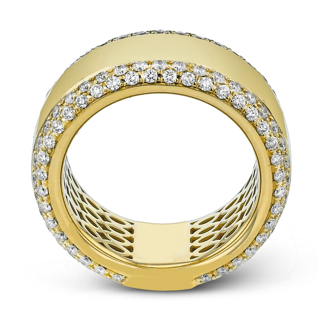 This luxurious band ring features a bold polished yellow gold center framed by two rows of brilliant diamonds. Its wide design blends modern sophistication with timeless sparkle, making it a striking statement piece.